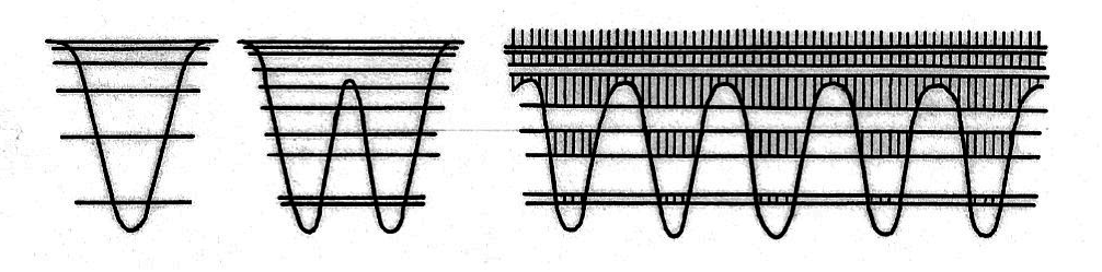 Die etwa 1927 vollendete Quantentheorie brachte zwei entscheidende Neuigkeiten. Die Unteilbarkeit des Wirkungsquantums $h$ ergab die quantentheoretische Unbestimmtheit, den Dualismus Welle-Teilchen, das Übergreifen der Wellenfunktion in benachbarte Potentialmulden, den "Tunneleffekt". Die Unteilbarkeit des Elektrons bedeutete die Ununterscheidbarkeit von Elektronen und die Fermi-Statistik. Für die Stoffeigenschaften sind beide Züge wichtig. Die aus dem erstgenannten Zug folgenden diskreten Energiezustände eines Atoms sind wegen des zweiten Zuges bis zu einer Stelle besetzt. Bei einer Molekel aus zwei gleichen Atomen sind wegen des zweiten Zuges die Energien paarweise geordnet. Bei einer Anhäufung von $N$ gleichen Atomen entstehen Gruppen von je $N$ Energiewerten; bei einer unendlichen periodischen Folge gleicher Atome entstehen "Energiebänder" einfacher Struktur, die bis zu einer Energie $\zeta$ besetzt sind (Abb. 2).